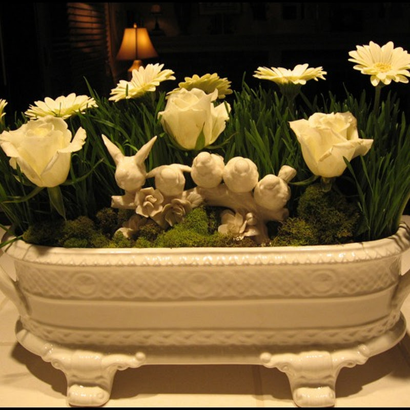 AFTER: FROM VERANDA. Taken in spring, the staircase has colorful flowers in urns on the stairs including Buff Beauty and Iceberg roses.