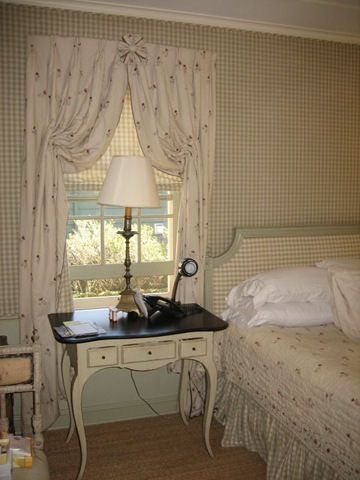 The master bedroom: House Beautiful did not show any pictures of this room. It is captured here from Cargill's web site, unstyled. The room has Chelsea Editions fabric wall covering along with Chelsea Editions curtain fabric and furniture. To the left, you can barely make out an antique Swedish sofa.