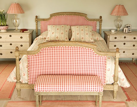 One of the daughter's bedroom with antique furniture and red checks. Note how the rug is actually three separate pieces.