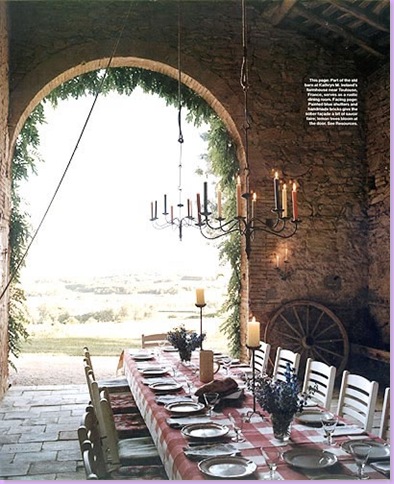 A romantic cave like porch on the french estate set for dinner. The tablecloth is made out of Ireland's checked fabric that is a mainstay of her fabric line.