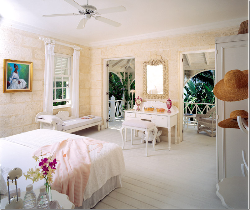 Continuing on our Caribbean theme, another important estate on the island of Barbados is known as The Great House. Built on 1 1/2 acres at Turtle Beach on the west side of the island, the house is famous for its former owners - Sir Evelyn de Rothschild and his then wife, Victoria. Though the main house is built of coral stone and resembles a centuries old plantation, it was built in 1988 by Ian Morrison, one of Barbados’ busiest architects. The main house has an airy, open feel with a master suite on the first floor and three bedrooms on the second floor, each with its own bathroom and verandah. Four chattel houses were added to property to further the appearance of age: chattel houses were typically found on the sugar plantations in the Caribbean and they housed the workers, or slaves. At The Great House, each Chattel House has one bedroom – two “Pink Chattel” bedrooms and two “Blue Chattel” bedrooms – making a total of 8 bedrooms on the estate. At the entrance of the property is a gatehouse with the offices, quarters and laundry room. And of course, there is a fabulous swimming pool and beautiful gardens that lead down to the beach. The house, currently for sale at over $27 million, was recently redecorated by Barbados and English interior designer Lynne Pemberton. Pemberton herself is quite a character – an author of racy novels, she has renovated and owned several hotels on the island, and has quite a busy career as a designer there. Pemberton brought a sophisticated island look to the house and used Ralph Lauren linens in the bedrooms. The former owners, the Rothschilds, are now divorced and Rothschild’s current wife Lady Lynn Forester de Rothschild made national headlines this political season when she suddenly dropped her democratic ties and endorsed John McCain. The Clintons, whom she vigorously campaigned for, and with whom she even spent her first honeymoon night with in the Clinton White House, must not have been too pleased to see her nightly on Fox TV trashing the democrats and O. The Rothschilds are great friends with the Obama’s new decorator, Michael Smith, who worked with them on their gorgeous New York apartment. It would be interesting to listen in on all those conversations between Smith and his clients! While, the newly decorated The Great House is beautiful, the older pictures from the Rothschild era are available to compare and contrast. Unfortunately, there is no record of who the original designer was, but it does make one wonder if Smith had a hand in it possibly? The owner today is a hedge fund honcho, Nick Niell, from England – perhaps selling because of the economic downturn? The house was bought for much less back then – figures are reported from $3 million and up, but nowhere near the now asking price of $27 million. Good luck to Mr. Niell. Without further ado – here is The Great House, now and then!