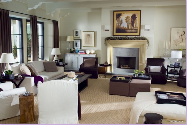 The media room, dark and cocoon like to watch Hollywood movies in: the ceiling retains the rafters, a reminder of the home's actual age and style. The walls are a deep chocolate brown, but the curtains are a white to provide that high contrast, as the white built in does. The floor is brown wall to wall carpet. Instead of a sofa, there is a line of four slipcovered, white chaises with brown pillows - what a great idea for a media room instead of those phony theatre seats you so often see!!! I love the black lamps behind each chaise and the brown cashmere throws. Oriental styled console is to the left. Also on the left, there appears to be that other over used theatre room prop: a popcorn machine!