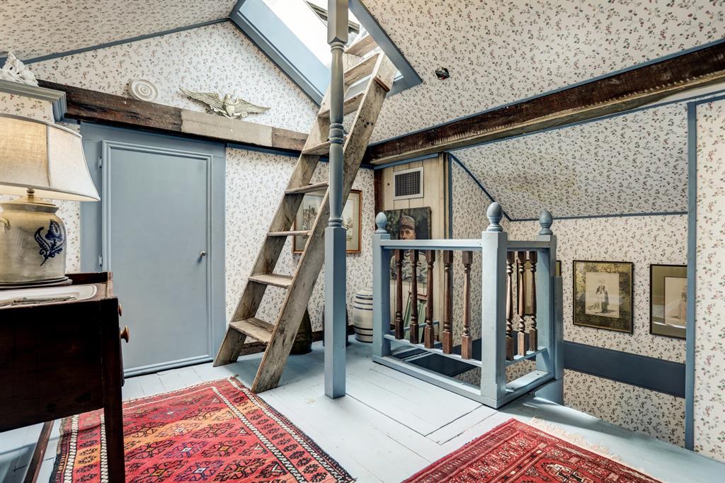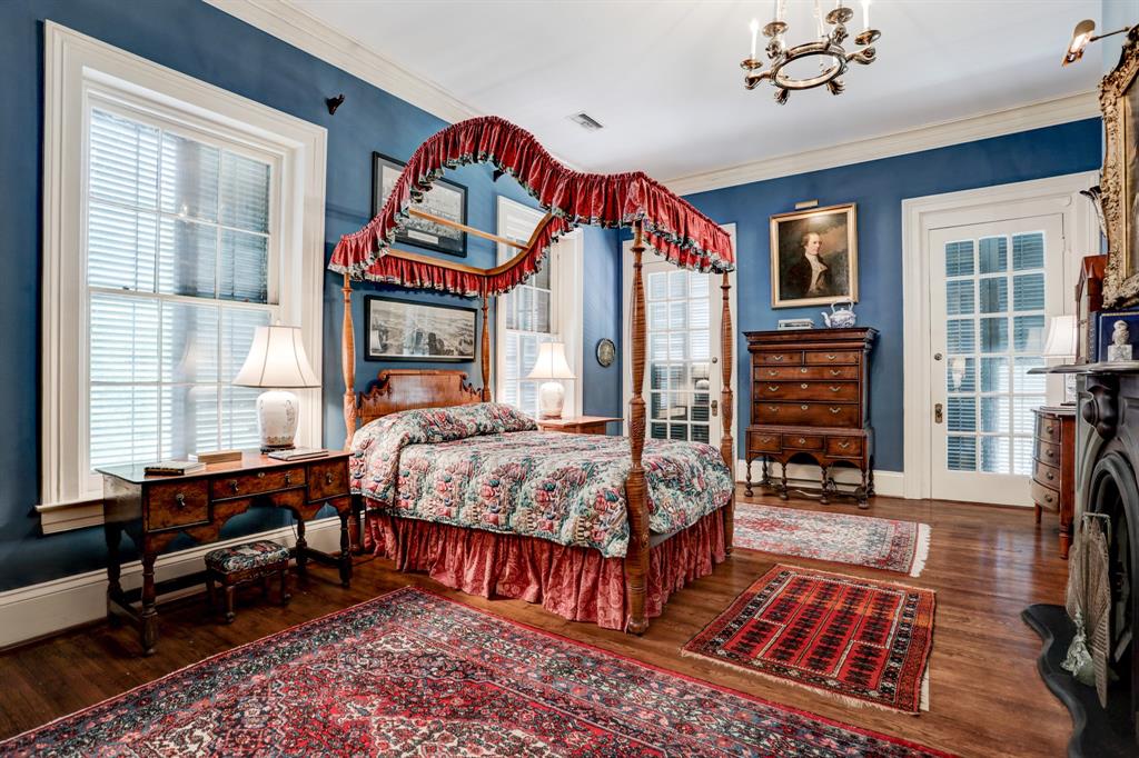 Upstairs, the original main bedroom sits off the front balcony through the French door, and atop the drawing room, below. This room is a darker French blue than the other, lighter shade on the first floor. As in all the other rooms – there are antiques and prints everywhere the eye rests. The estate must have removed all the curtains.