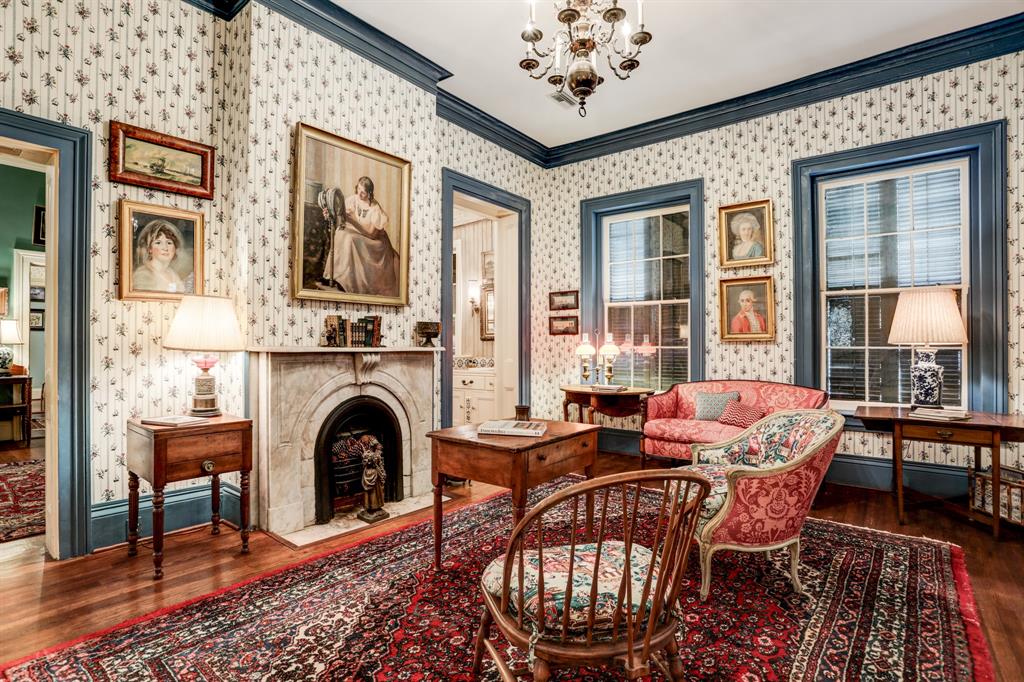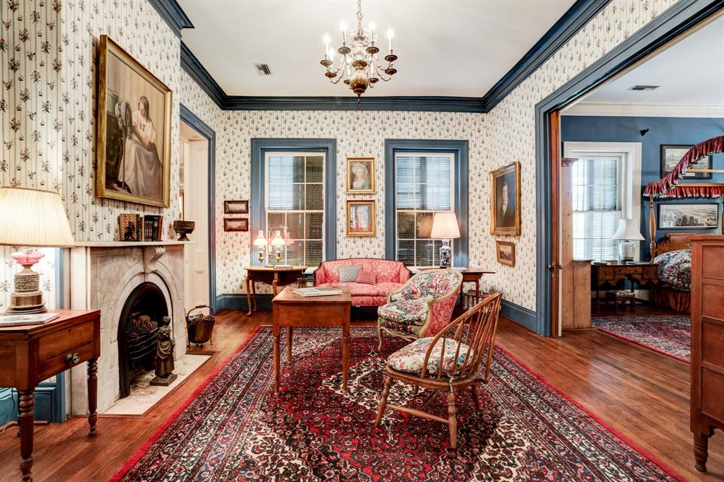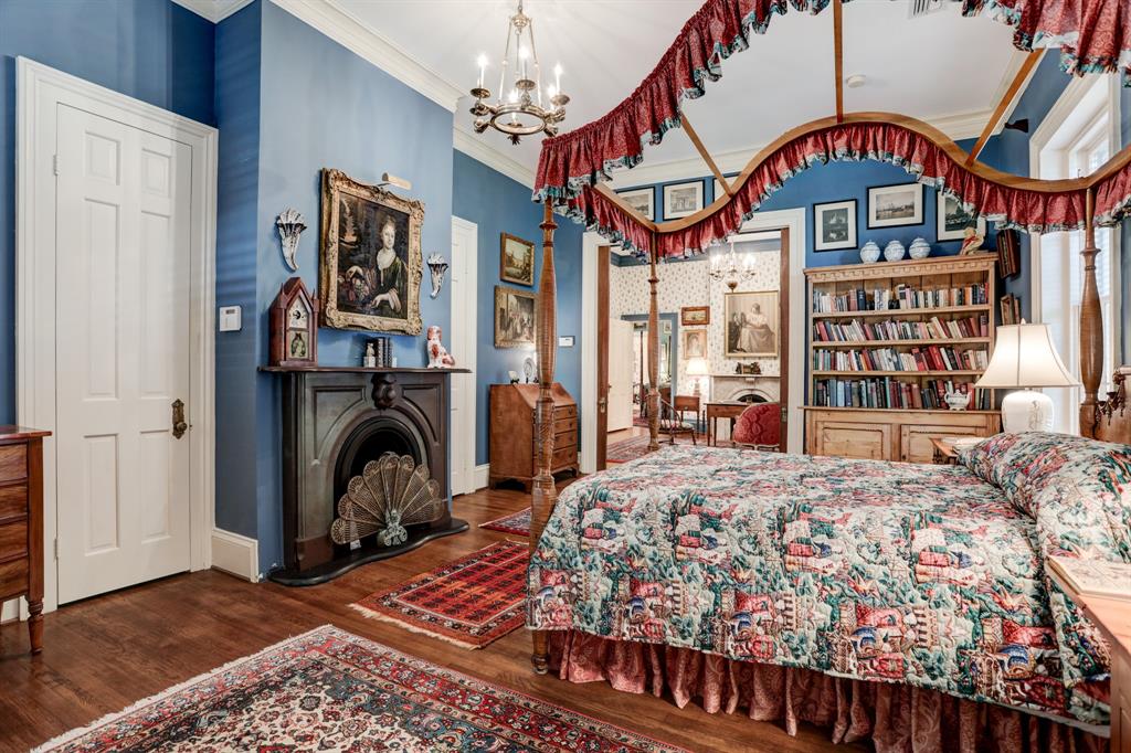 Through beautiful, original pocket doors is a sitting room. Italian black marble mantel. Not loving the little ruffle on the canopy – it would look better with no fabric. IMO.