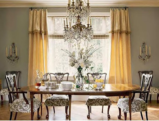 In a dining room, a Niermann Weeks chandelier is a traditional choice. Note how much drama the drapes add to the overall design. The room would not be as pleasing without that element.