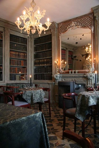 One of my favorite pictures here: a kitchen with an eat in dining room. Without the pot rack, it would be hard to actually see this is a kitchen. The French stove looks like a jeweled box with ormolu. The light fixture plays off the brass of the range. Beautiful!