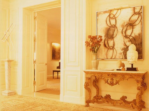 Published, the entry hall, all sunny creams again - wonderful artwork and antique console.