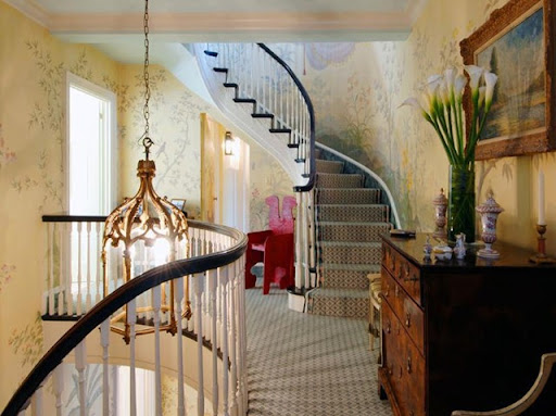This beautiful English inspired three story apartment was too pretty not to show, but the designer was not named. I have my thoughts on who the designer is - see if you do too. The entry stairwell is notable for its hand painted wallpaper which gives a somewhat whimsical touch to what could have been an overwhelmingly formal room. I think this is an apartment with a younger family living here.