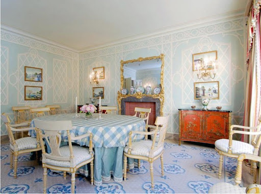 The dining room with trellised paper and checked tablecloth.